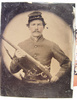Two portraits of an unidentified soldier in Union uniform and Zouave uniform with bayonet and sheath, bowie knife, and Smith and Wesson revolver
