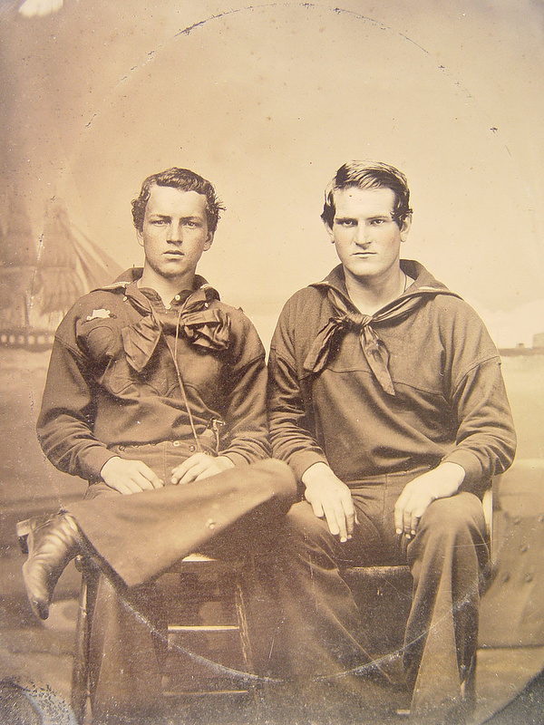 Two unidentified sailors in Union uniforms in front of painted backdrop showing sea with monitor class warship and another ship