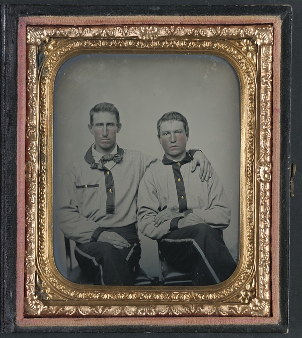 Private Peter S. Arthur of Company B, 11th Virginia Infantry Regiment, in uniform with secession badge and Virginia state seal breastplate