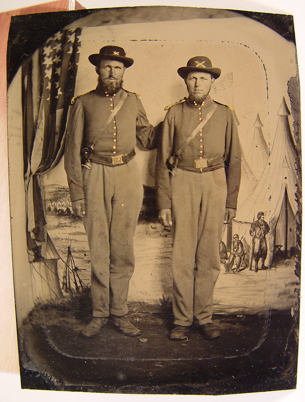 Two unidentified soldiers in Union artillery shell jackets with shoulder scales and slouch hats in front of painted backdrop showing military camp