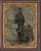 Two unidentified soldiers in Union private's uniforms sitting next to table with cannon ball on top; one soldier has an amputated leg and holds crutches