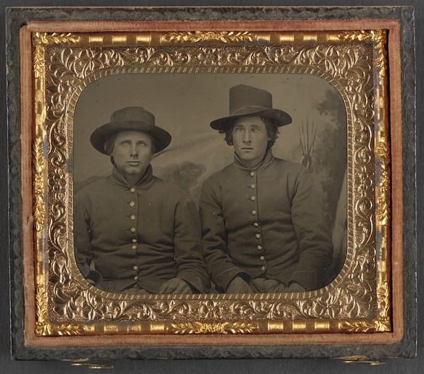 Two unidentified soldiers in Union privates' uniforms in front of painted backdrop