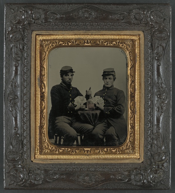 Two unidentified soldiers in Union uniforms drinking whiskey and playing cards