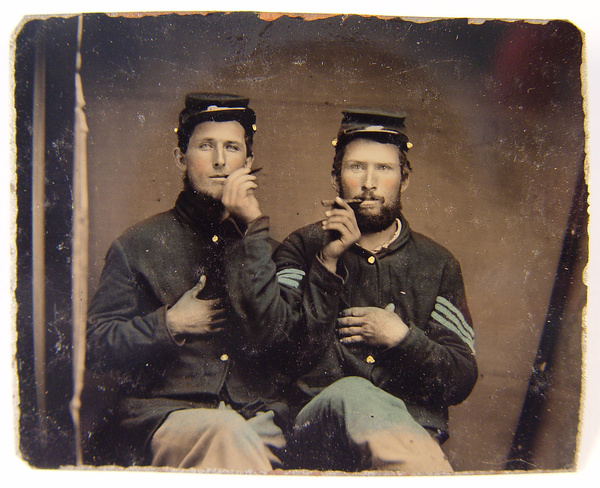 Two unidentified soldiers in Union uniforms holding cigars in each others' mouths