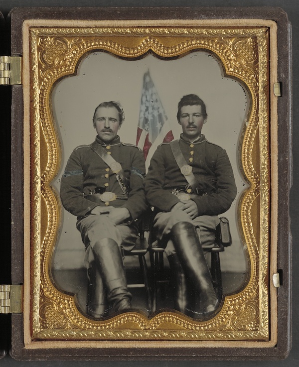 Sergeant Tom Strawn of Company B, 3rd U.S. Colored Troops Heavy Artillery Regiment, with revolver in front of painted backdrop showing balustrade and landscape