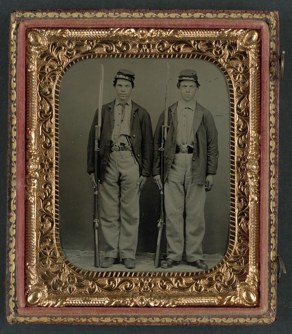 Two unidentified soldiers in Union uniforms with bayoneted muskets and pistols