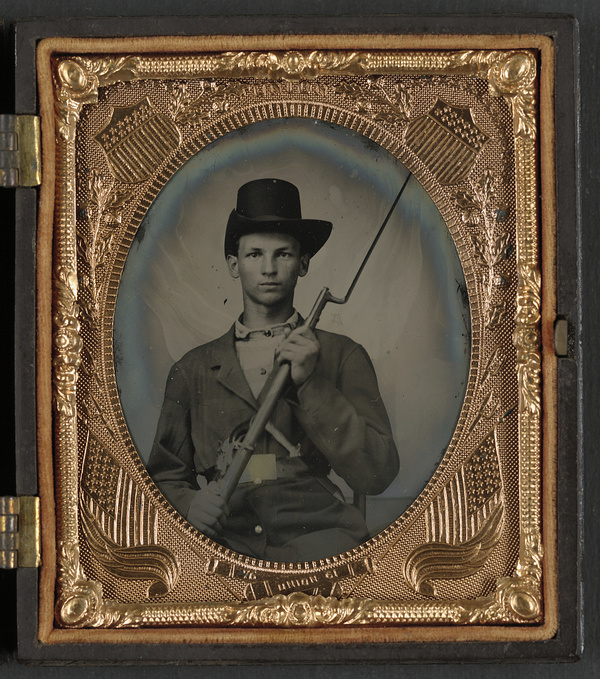 Two unidentified soldiers in Union uniforms with bayoneted muskets