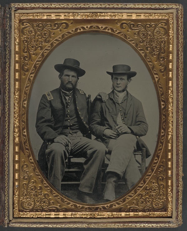 Unidentified soldier in Union zouave uniform with bayoneted musket with initials A.T. on stock