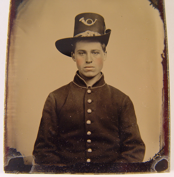 Two unidentified soldiers in Union uniforms with Hardee hats bearing infantry insignia
