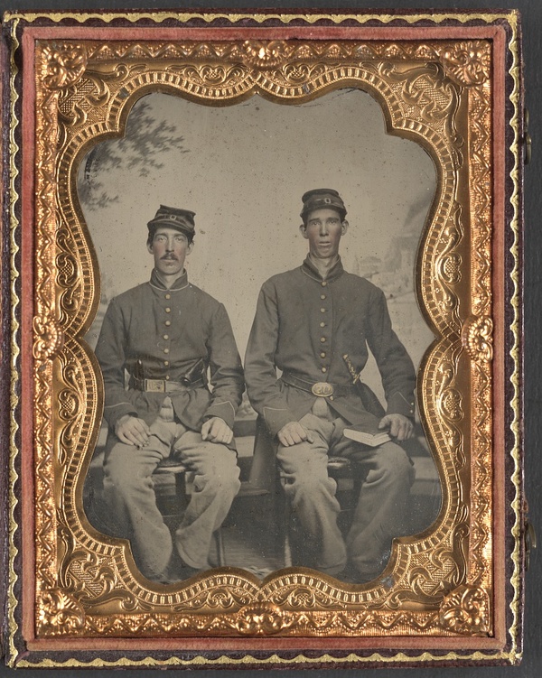 Two unidentified soldiers in Union uniforms with sword and book in front of painted backdrop