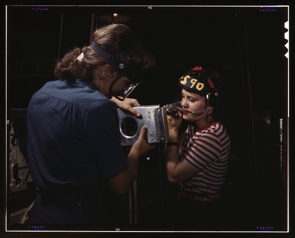 Two women employees of North American Aviation, Incorporated, assembling a section of a wing for a P-51 fighter plane