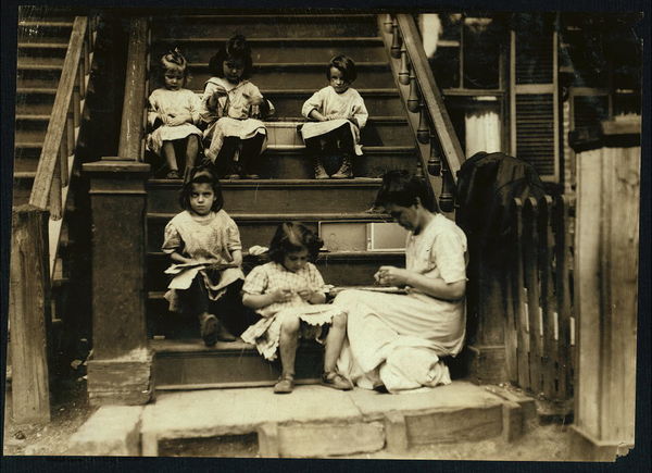 Typical group of workers on tags. Steps of Mrs. Dolan, 279 Highland Street, Roxbury, Mass. Location: Roxbury, Massachusetts.