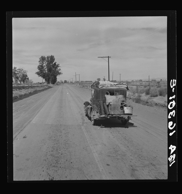 Woman in pea picker's camp. California. "I seen our corn dry up and blow over the fence back there in Oklahoma"