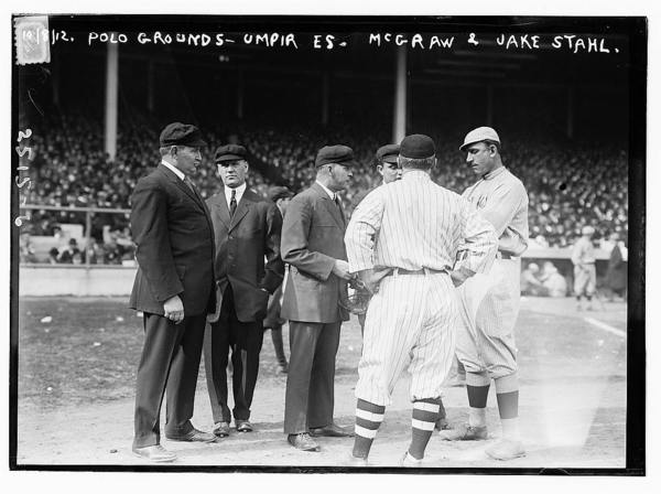 Umpires with managers John McGraw (back to camera), New York NL, and Jake Stahl, Boston AL, first game of 1912 World Series (baseball)