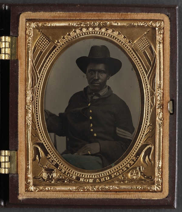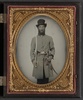 Unidentified soldier in Union cavalry uniform with sword and pistol in front of painted backdrop tree stump and military camp
