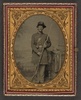 Unidentified soldier in Union sergeant's uniform sitting on a chair and holding a musket