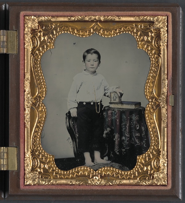 Unidentified boy holding cased photograph of soldier in Confederate uniform atop a Bible / Rees.