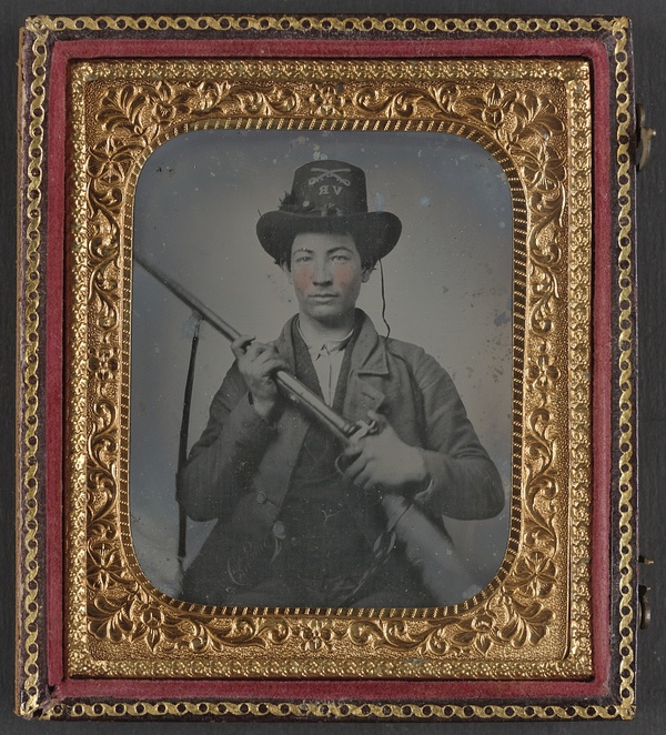Unidentified cavalry soldier in Confederate uniform and Valley Rangers, 10th Virginia Infantry Regiment hat, with double barrel shotgun