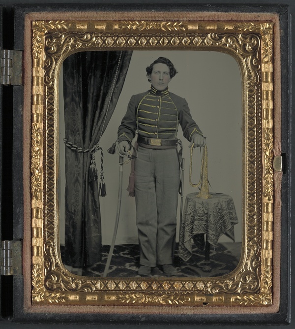 Unidentified cavalry soldier in Union uniform with bugle and sword
