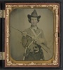 Unidentified cavalry soldier in Confederate uniform with slant breech sharps carbine, two knives, and two revolvers