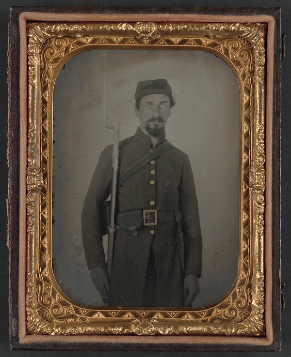 Unidentified private in Confederate uniform and Georgia frame buckle with bayoneted musket