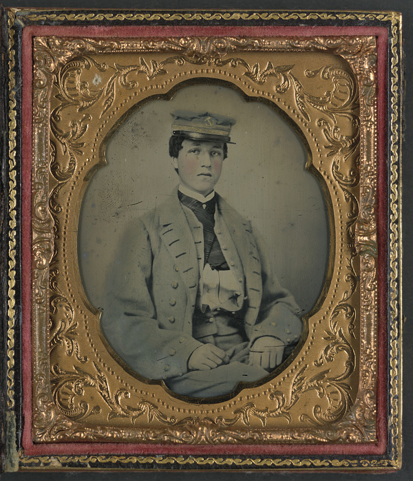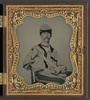 Soldier in Confederate uniform and Co. D, 3rd North Carolina Volunteers Regiment hat with short sword and sheath with initials J.L.W., probably for Private John L. Wood of Co. D, 3rd North Carolina Infantry Regiment
