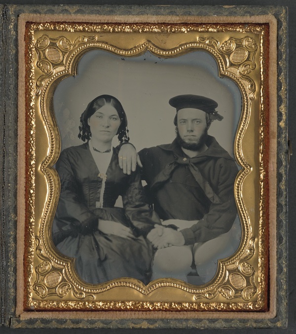 Two unidentified soldiers, possibly father and son, in Union uniforms and U.S. belt buckles with bayoneted muskets