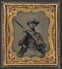 Private John P. Alldredge of Co. A, 48th Alabama Infantry Regiment in uniform and wishbone belt buckle with Model 1842 rifle musket, revolver, and side knife