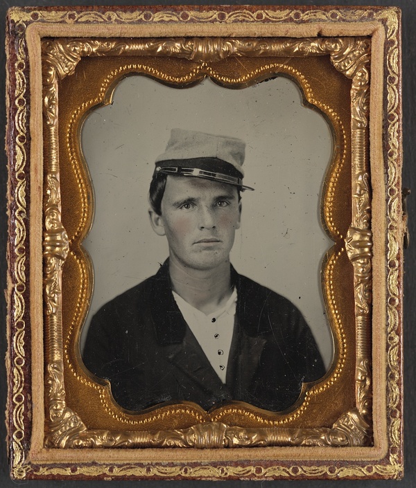 Thomas Isaiah Booker in Confederate uniform with Colt navy revolver, book, tin drum canteen, and sign reading Jeff Davis and the South!