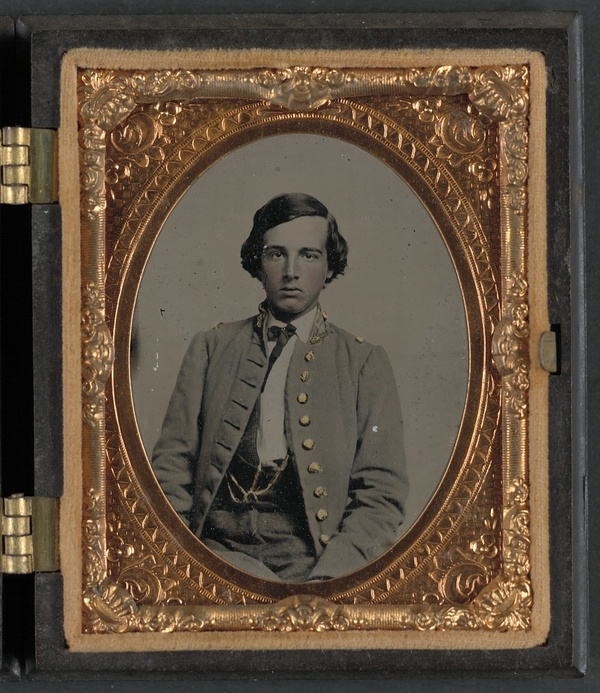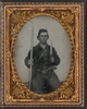 Unidentified soldier in Confederate uniform with D-guard Bowie knife, musket, and revolver