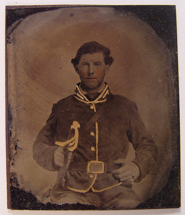 Unidentified soldier in Confederate second lieutenant cavalry uniform with sheathed cavalry sword
