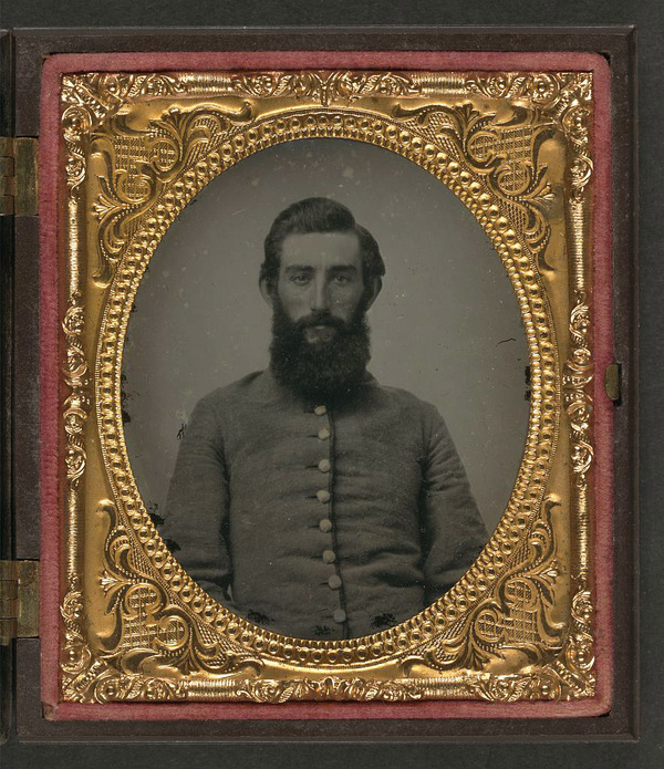 Unidentified soldier in Union frock coat, forage cap, and gloves with bayoneted musket in front of painted backdrop showing military camp