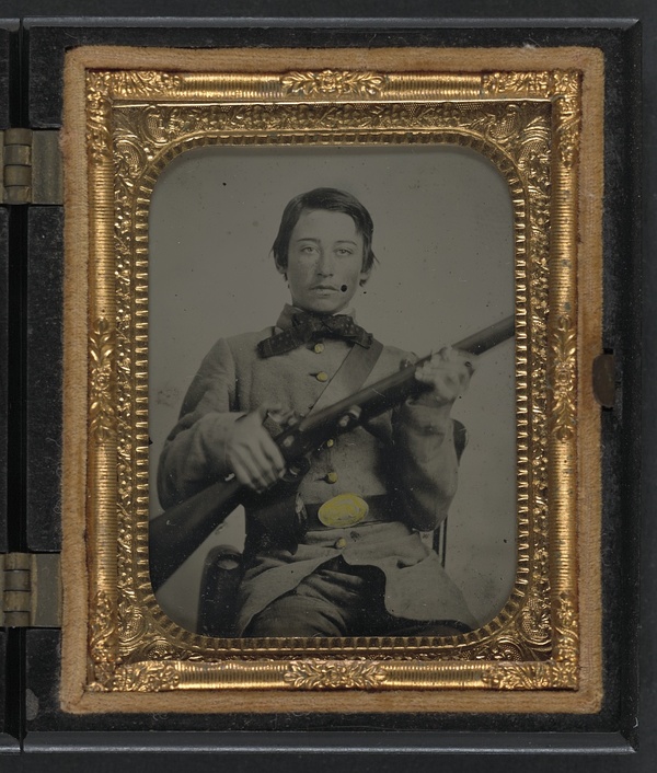 Unidentified soldier in Confederate uniform and C.S. oval belt plate with rifle