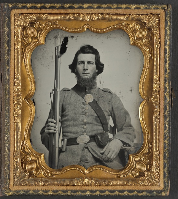 Unidentified soldier in Confederate uniform and Georgia state seal belt buckle with musket
