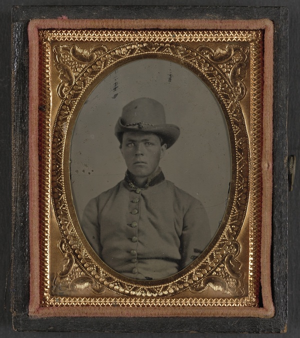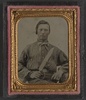 Unidentified soldier in Confederate uniform with D guard Bowie knife