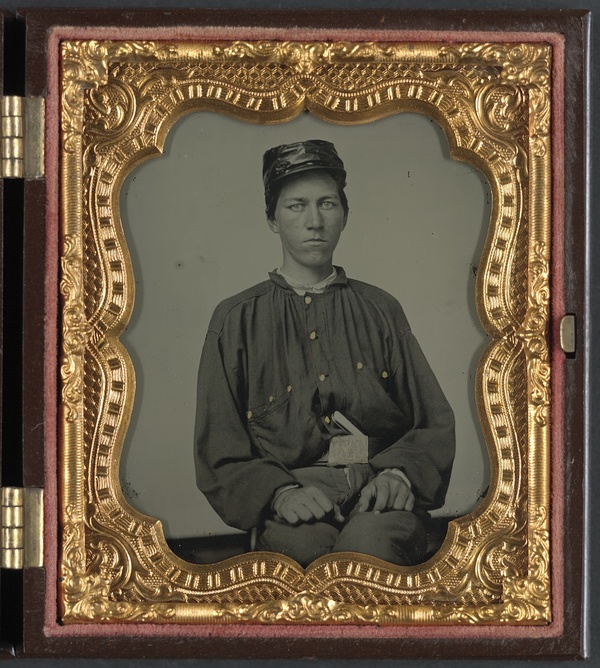 Unidentified soldier in Confederate uniform and Louisiana state seal belt buckle and oilcloth cover on kepi