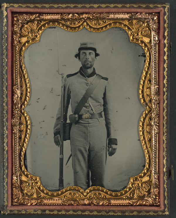 Unidentified soldier in Confederate uniform with bayoneted musket and knife