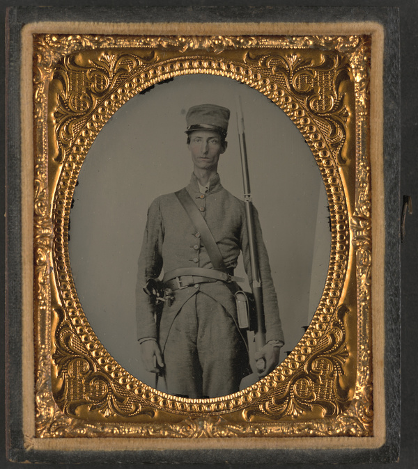 Unidentified soldier in Confederate uniform with bayoneted musket and pistol