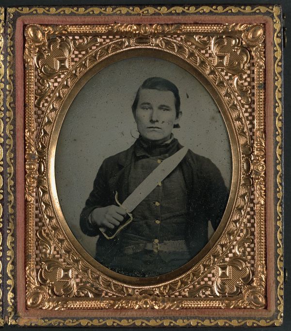 Unidentified soldier in Confederate uniform with D-guard Bowie knife