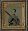 Unidentified soldier in Confederate uniform and Louisiana state seal belt buckle with musket