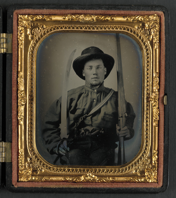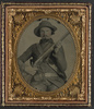 Unidentified soldier in Confederate uniform with double barrel shotgun, Bowie knife, and two pistols