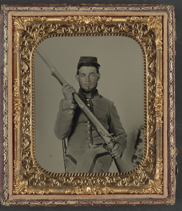 Unidentified soldier in Confederate artilleryman uniform and greatcoat with sword
