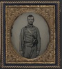 Private David Lowry, of Company E, 25th Virginia Cavalry Regiment, Company A, 41st Virginia Infantry Regiment, and Company D, 47th Virginia Infantry Regiment, in uniform and corsage of flowers with musket and book