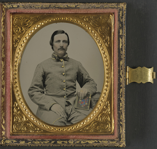 Unidentified soldier in Confederate uniform with photograph case