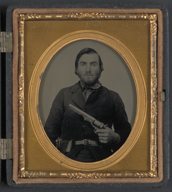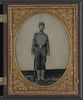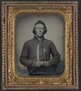 Corporal Samuel H. Overton of A Company, 44th Virginia Infantry Regiment and A Company, 20th Battalion Virginia Heavy Artillery Regiment in uniform and kepi with bayoneted musket