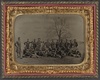Group of 26 unidentified soldiers in Union uniforms with stacked bayoneted muskets in front of tree