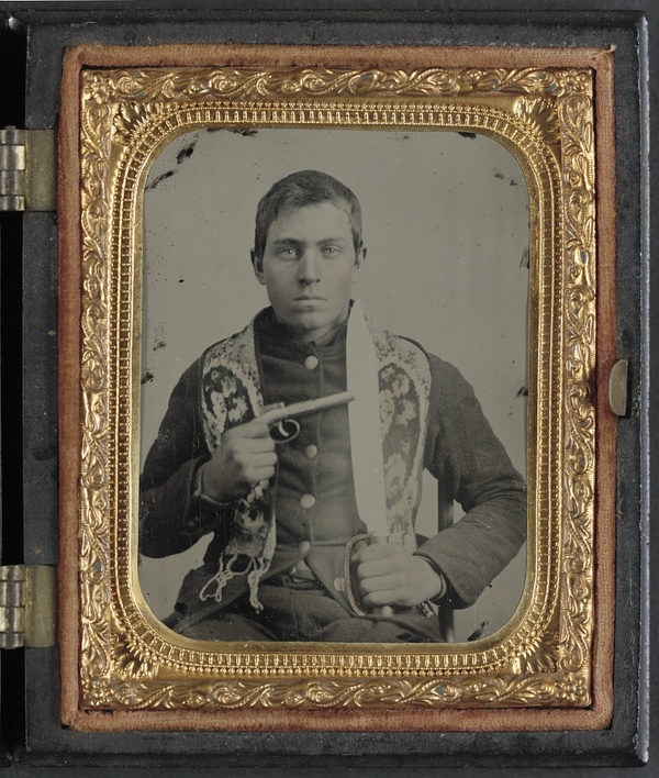 Unidentified soldier in Confederate uniform with single shot percussion pistol and D guard Bowie knife