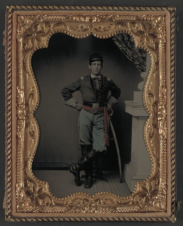 Unidentified soldier in first lieutenant's uniform, red sash, leather gauntlets, and spurs with cavalry sword