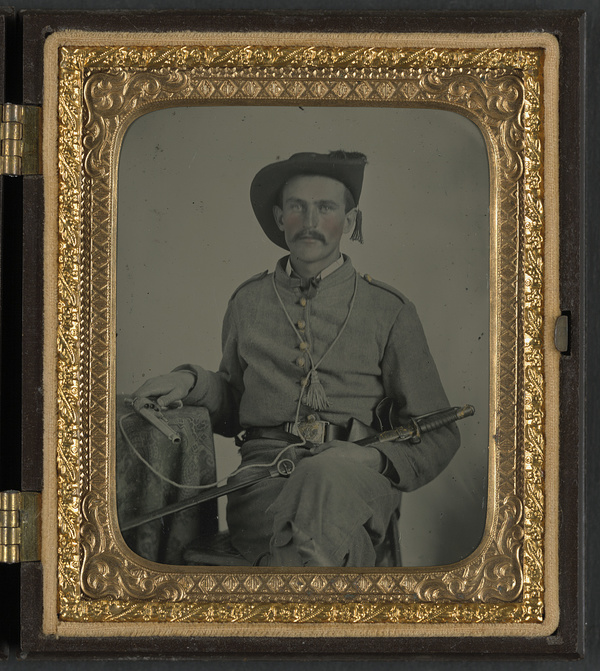 Unidentified soldier in Maryland Confederate cavalry uniform with sword and pistol