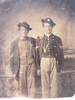 Two unidentified soldiers in Union uniforms and slouch hats in front of painted backdrop
